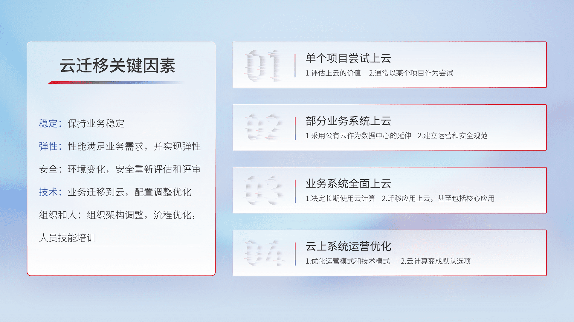 结合实际业务,,,从规划设计、、云平台选型、、、云原生改造、、数据迁移、、、、集成交付,,,,迁移全过程为客户识别最佳上云路径,,,做好风险识别管理,,,,设计网络架构、、身份权限、、安全审计合规、、、操作审计、、、、日志审计、、监控告警策略、、多站点容灾设计等,,,对云上基础设施进行整体规划,,,提升IT治理水平,,,以满足弹性、、、高可用、、高性能的需求。。