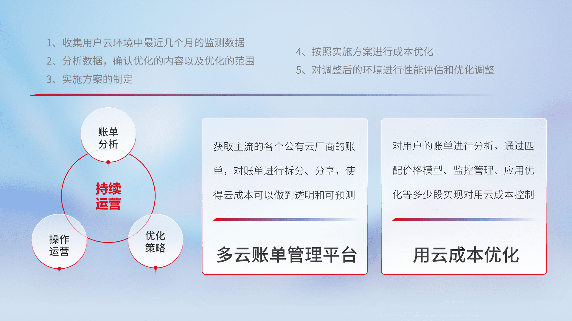 通过多云纳管,,,,以统一的资源数据模型把客户的云资源进行抽象和封装,,进而实现对多云资源的统一操作,,,保障云资源管理的可靠性、、、稳定性与可用性。。量身定制化运维内容,,配置、、、开发运维、、、补丁管理、、、、备份、、、、监控、、、认证和访问管理、、、、审计和日常巡检等,,保障在用云过程中的可靠度,,稳定度以及高可用率。。。。