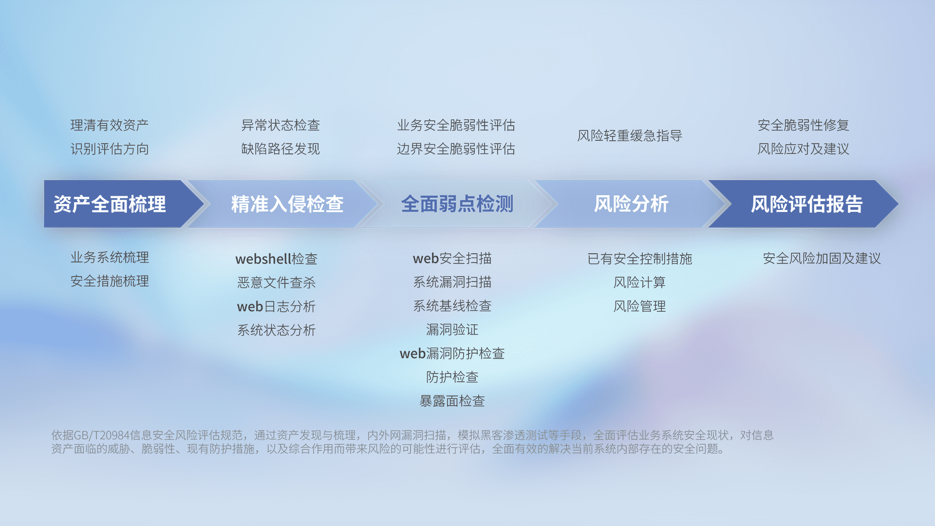 针对客户行业特性,,,,以专业的安全服务+多厂商联合解决方案提供专属的一站式安全管理服务,,,帮助客户全面感知网络空间威胁,,,基于识别、、、、检测、、、分析、、防护、、、、监测、、响应的服务理论模型,,,从方案咨询、、、、集成交付、、、评估验证、、、、优化加固、、、、运维运营,,致力于为客户提供完整的闭环管理式安全服务。。以实战经验为客户打造高抵御风险的安全体系,,,,帮助客户发现威胁、、、对抗威胁、、、处置威胁,,,不断积累安全对抗能力,,,,持续保障数字化安全。。。